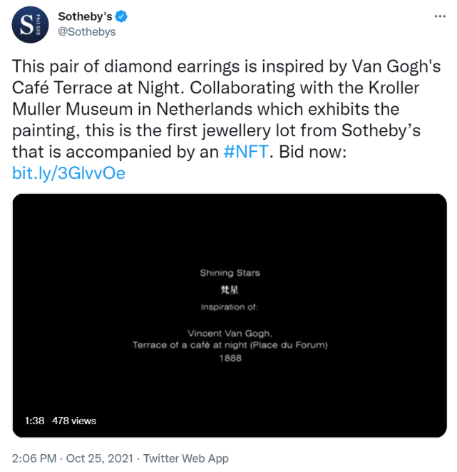 PANews 10月25日消息,拍卖行苏富比发推宣布上线首个NFT珠宝拍品《梵星》。这对钻石耳环的灵感来自于梵高名画《夜晚露天咖啡座》(Café Terrace at Night),目前收藏在荷兰克罗尔·穆勒博物馆(Kroller Muller Museum)。《梵星》也是苏富比与克罗尔•穆勒博物馆合作的第一件NFT珠宝拍品。