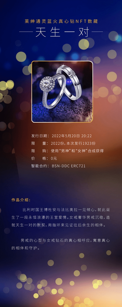 2022年5月20日,比利时王室珠宝供应商莱绅通灵将首次发布品牌蓝火真心钻NFT数字藏品。作为全球首款由高端珠宝品牌授权发行的数字对戒,莱绅通灵蓝火真心钻NFT数字藏品完美诠释了爱情的浪漫与忠贞,为元宇宙时代的年轻人创造了表达爱意的最佳数字潮品。