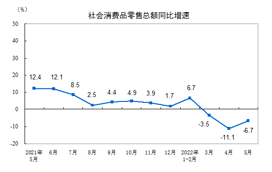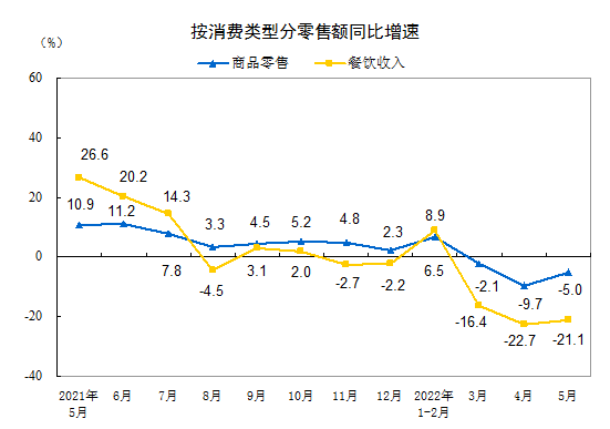2022年1—5月份社会消费品零售总额下降1.5%