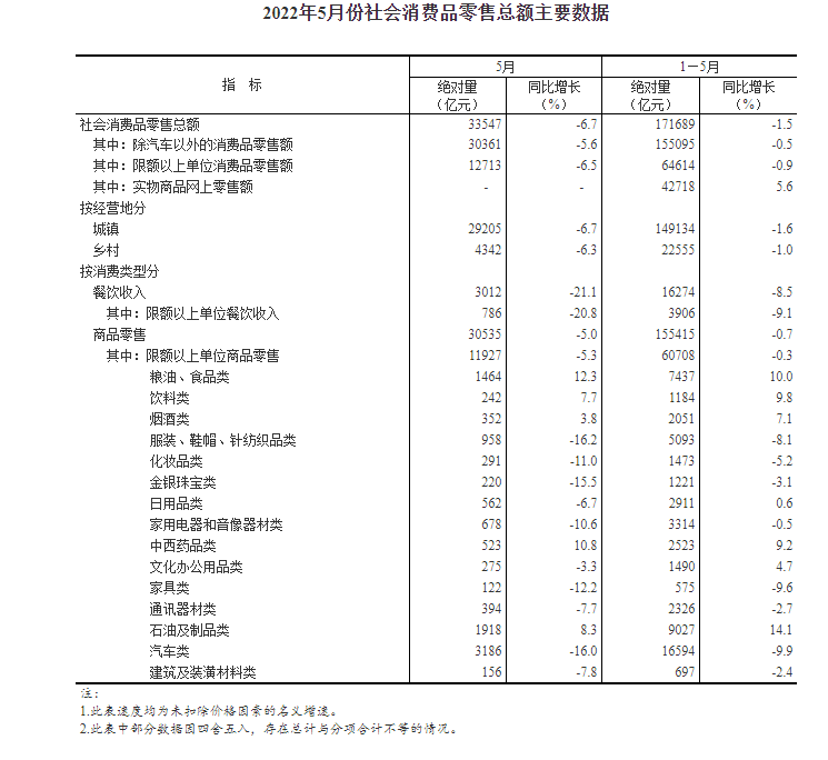 5月份,社会消费品零售总额33547亿元,同比下降6.7%。其中,除汽车以外的消费品零售额30361亿元,下降5.6%。