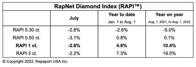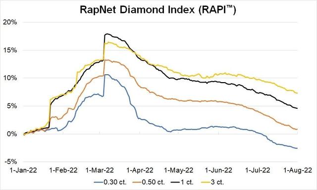 七月份,一克拉RAPI价格指数下降2.6%,同比上升10.4%,今年年初至8月1日一共上升4.6%。(如下图)
