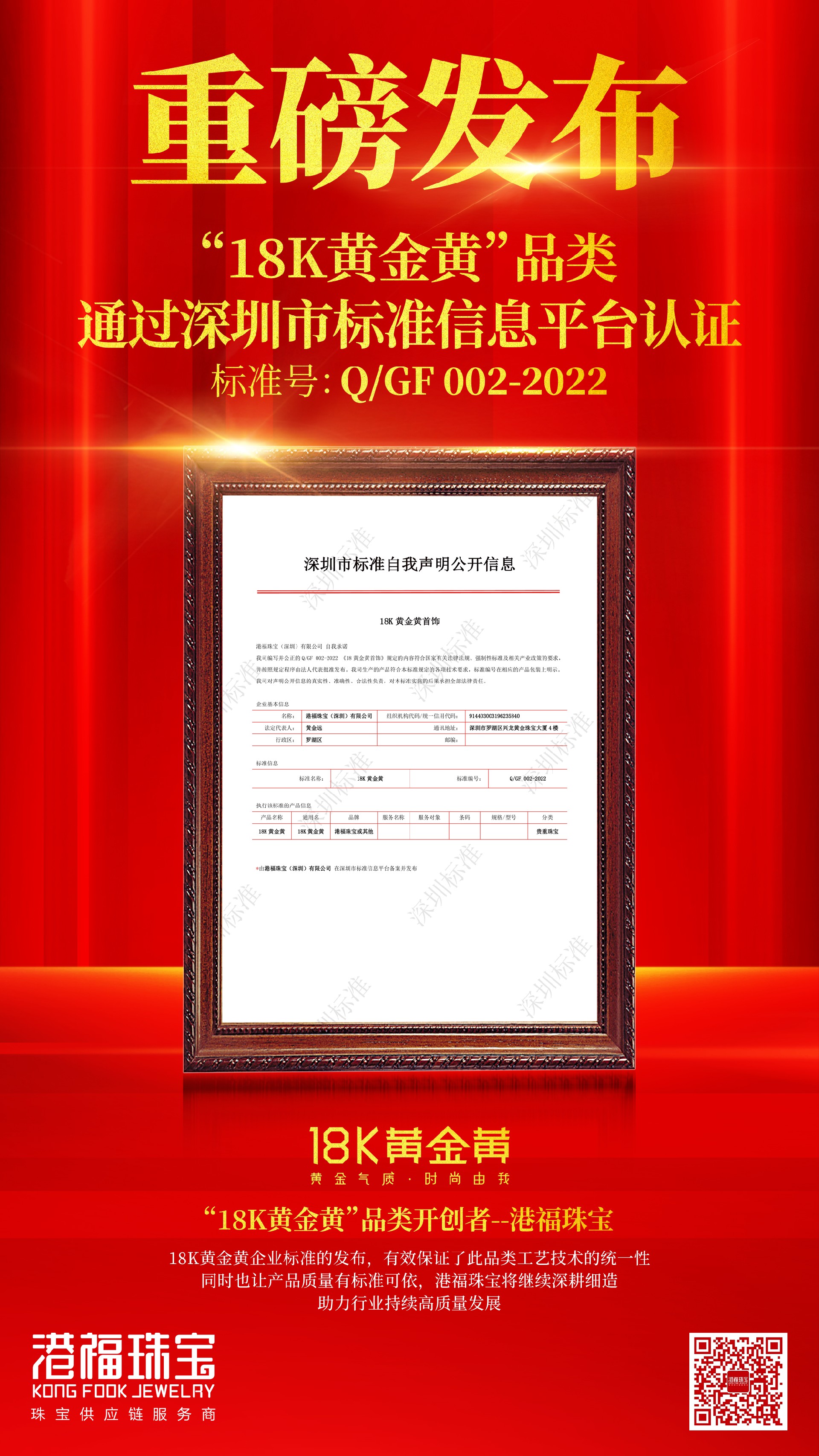 重磅!创新品类“18K黄金黄”首个企业标准正式公开 发布时间:2022-08-13 | 浏览次数:1003 近日,深圳市标准信息平台权威发布了港福珠宝《18K黄金黄首饰企业标准》,标准号为:Q/GF 002-2022.(以下简称《标准》)