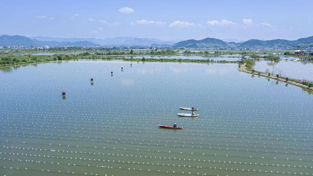 浙江清湖控股集团有限公司研发出“滴管”养殖珍珠蚌的方法。蚌塘内,工作人员正在检查蚌的生长情况。新华社发