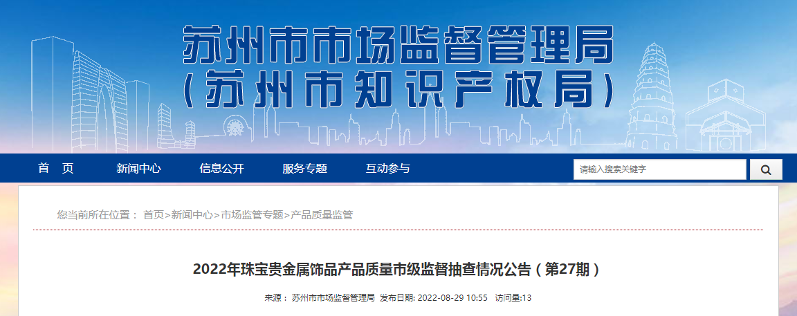 近日,江苏省苏州市市场监管局网站公布2022年珠宝贵金属饰品产品质量市级监督抽查情况公告(第27期)。